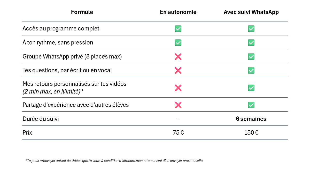 Le suivi WhatsApp optionnel dure 6 semaines à partir de la date de démarrage du groupe. La prochaine session commence fin 2025